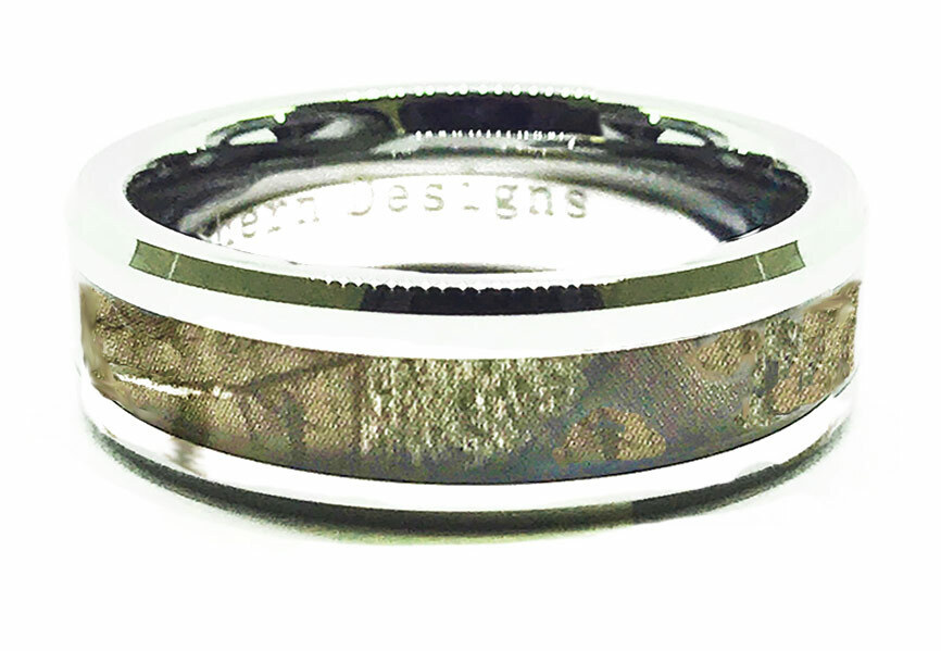 Men's Country and Camo Wedding Ring. A Top Selling Silver Titanium Band in 8 mm width. An outdoors camouflage pattern is used for the remarkable graphic inlay. This ring has a 10 year warranty and is a best seller every single year. Similar rings sell for over $200.